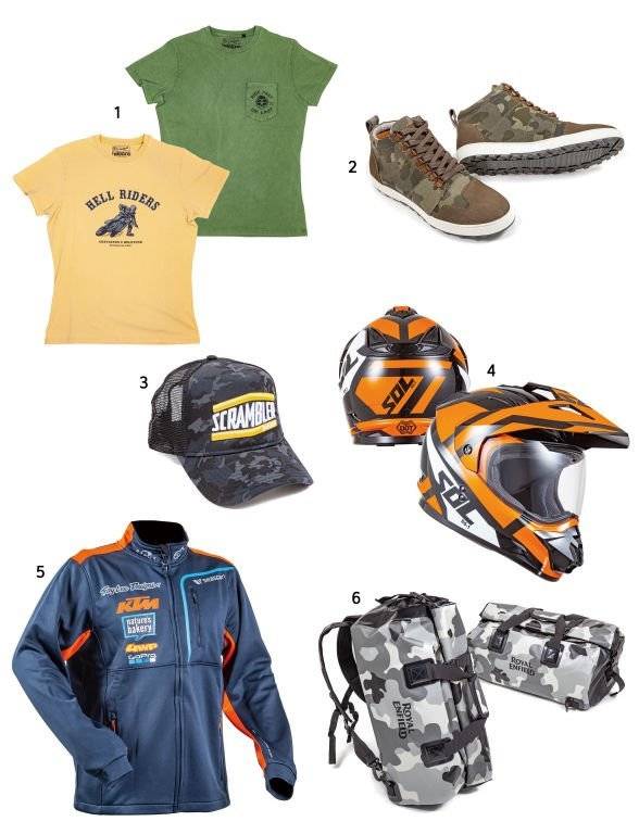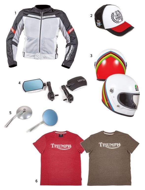 1. TRIUMPH 바스토우 고글 스크램블러 1200 시리즈 출시를 기념하여 출시한 한정판 고글. 모스트랩과 가죽에 트라이엄프 로고로 꾸몄다. 모터바이크는 물론 자전거, 윈터 스포츠 고글로 유명한 100%의 클래식 라인업인 바스토우 제품이다. 긁힘에 강한 렉사 온 렌즈가 사용되었으며 넓고 깨끗한 시야를 제공한다.