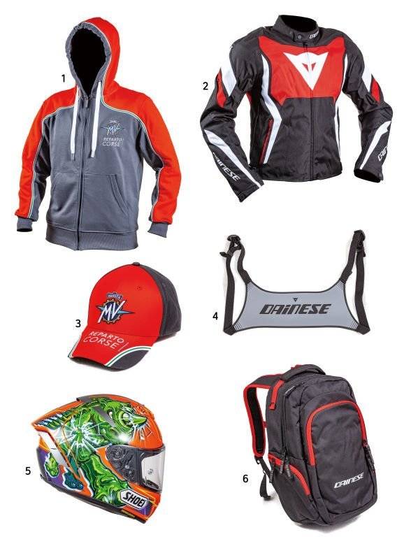 1. DUCATI 코르세 써머 C2 재킷 모토 GP 라이더 발렌티노 로시의 헬멧 디자이너로 유명한 알도 드루디가 디자인한 메시 재킷. 다이네즈와 함께 제작했으며 메시와 가벼운 직물로 제작되었다. 팔꿈치 보호대가 내장되어있으며 어깨엔 알루미늄 플레이트를 적용해 안전성을 확보했다.