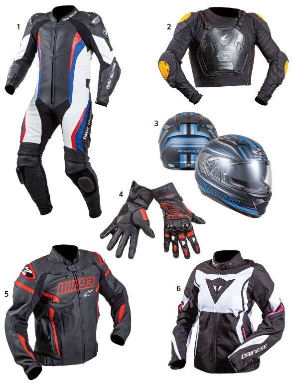 1. BMW MOTORRAD 프로 레이스 슈트 BMW 모터라드의 스포츠 라인업인 M 스포츠의 컬러가 적용된 레이스 슈트. 내마모성이 뛰어난 소가죽을 기본으로 하며 캥거루 가죽과 자신만의 디자인으로 개별 주문할 수 있다. 어깨와 팔꿈치, 엉덩이와 무릎에 프로텍터가 적용된다. 경추 보호대와 등 부분의 디자인이 공기역학을 고려해 설계되었다. 슈트 곳곳을 타공해 통기성을 고려했으며 팔 안쪽과 허벅지 안쪽에 스판 소재를 적용해 무게 이동 시 편안한 움직임을 돕는다.