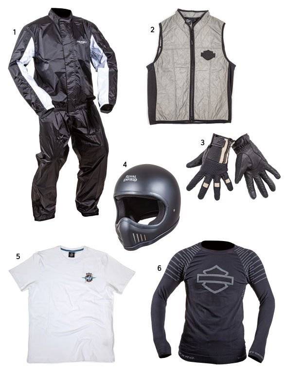 1. TRIUMPH 레인 재킷, 진 장시간 비를 맞아도 물이 스며들지 않을 만큼 두껍다. 재킷의 지퍼는 이중 처리되었고 허리와 팔목, 발목에 미끄럼 방지 고무 밴드가 적용되어 비를 막는다. 발목엔 벨크로가 추가되어 펄럭이지 않고 딱 맞게 조절할 수 있다.