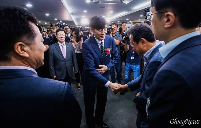 | ▲ 조국 신임 법무부 장관이 9일 오후 경기도 정부과천청사 법무부에서 열린 취임식을 마치고 직원들에게 다가가 인사를 하고 있다. |