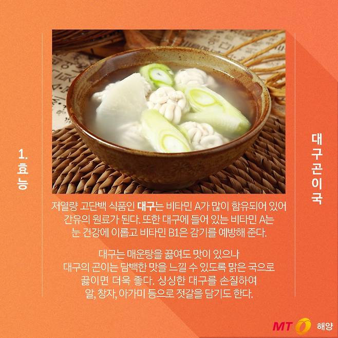 대구에 들어있는 비타민A는 눈 건강에 이롭고 비타민B1은 감기를 예방해 준다.