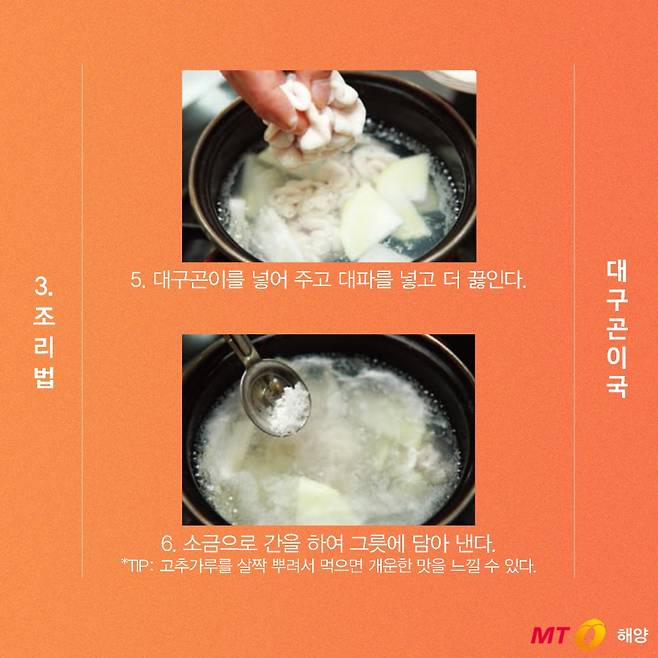 [편집자주] [바다정보다잇다]의 수산물 레시피는 재미있고 유익한 수산물 정보를 제공하고 수요자와 공급자를 잇기(연결하기) 위한 기획 콘텐츠입니다. 수산물 소비촉진을 위해 MT해양과 해양수산부 어식백세와 함께 올바른 수산물 정보와 맛있는 우리 수산물 요리를 전합니다.