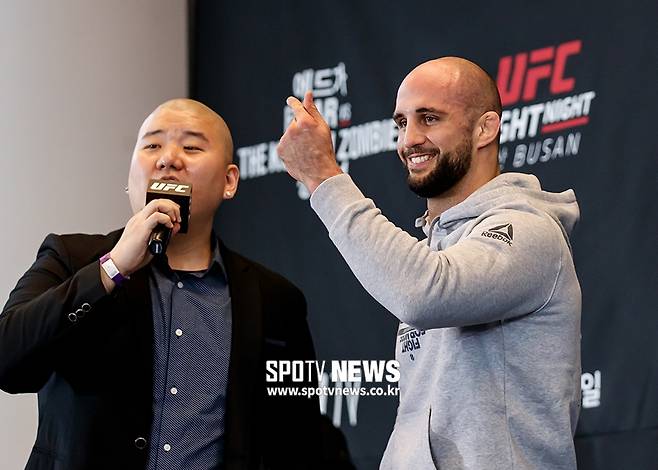 [스포티비뉴스=부산, 한희재 기자] UFC 부산 대회에 출전하는 파이터 볼칸 우즈데미르가 18일 오후 부산시청에서 공개훈련을 마친 후 팬들의 환호에 답하고 있다.