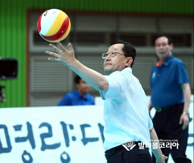 【발리볼코리아닷컴(해남)=김경수 기자】 15일(목) 전남 해남군 해남읍 우슬체육관에서 열리는 2019 현대캐피탈배 전국대학배구 해남대회 남자대학부 A그룹 결승전 경희대 vs 경기대 경기에 앞서 해남군 명현관군수가 시구를 하고 있다.