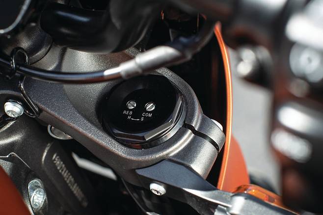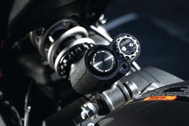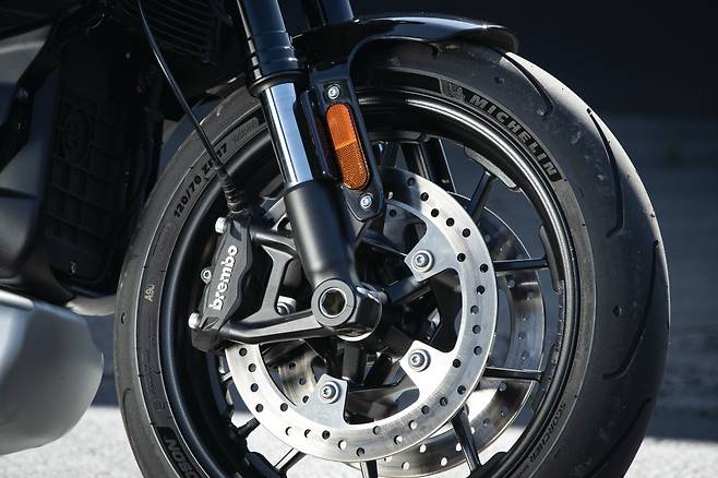어려운 용어들을 좀 풀어놓자. 도립식 프런트 포크는 풀어저스터블 타입의 쇼와 SFF-BP포크에 리어는 역시 풀어저스터블 타입의 BFRC(밸런스 프리 리어쿠션)라이트 모노쇽이 장착된다. 일반적으로 슈퍼바이크에나 장착되는 서스펜션 사양이다. 여기에 브레이크는 래디얼타입의 브렘보 캘리퍼가 300mm 더블디스크에 물려있어 제동력과 컨트롤은 놀랄 만큼 좋다. 타이어는 라이브와이어를 위해 새롭게 개발된 스포츠 사양의 미쉐린 스코쳐 스포츠가 기본으로 장착된다. 휠 스펙이 일반적인 스포츠바이크에서 널리 쓰이는 전후 17인치 사양으로 다양한 하이 그립과 스포츠 투어링 타이어를 사용할 수 있다. 복잡한 이야기가 많았지만 싹 지우고 다시 쉽게 정리하면 할리데이비슨 브랜드 역사상 가장 스포티한 세팅이란 뜻이고 그 만큼 잘 돌고 잘 서기 위한 양질의 파츠를 사용하고 있다는 말이다.