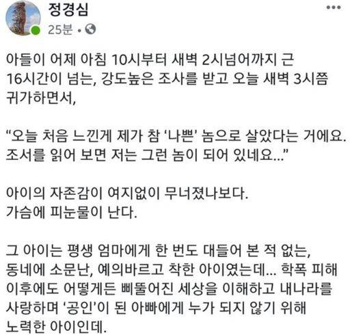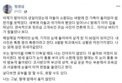 이 글은 이달 중순부터 페이스북을 통해 언론 보도 등에 대한 해명 글을 주로 올렸던 정 교수가 검찰 조사에 대한 심경을 처음으로 털어 놓은 게시글로 언론과 지지자들의 큰 관심을 받았다.