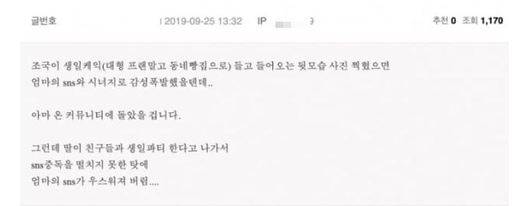 지난 25일 오후 1시30분쯤 진보성향 온라인 커뮤니티로 알려진 ‘엠엘비파크’에는 ‘어제 조국 딸 생일 때 만약…’이라는 제목의 글이 올라왔는데 글 작성자는 “(딸 생일에) 조국이 생일 케이크 들고 들어오는 뒷모습 사진 찍혔으면 엄마 소셜미디어와 시너지로 감성 폭발했을 텐데”라고 했다.