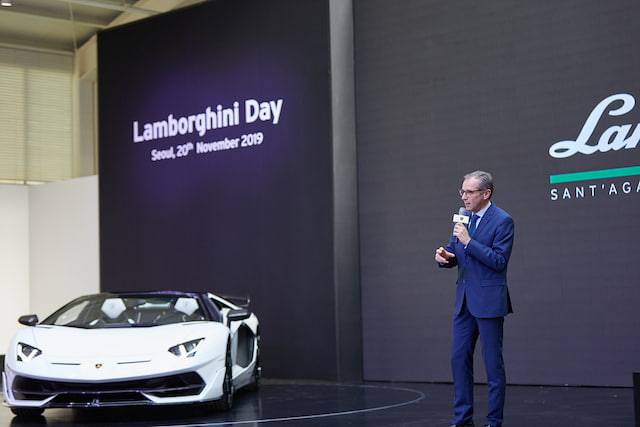 이날 행사에는 한정판 모델인 아벤타도르 SVJ 로드스터가 국내 최초로 소개됐다. 차량 프레젠테이션은 마테오 오르텐지(Matteo Ortenzi), 람보르기니 아시아 태평양 지역 최고 경영자 (Chief Executive Officer)가 담당했다.