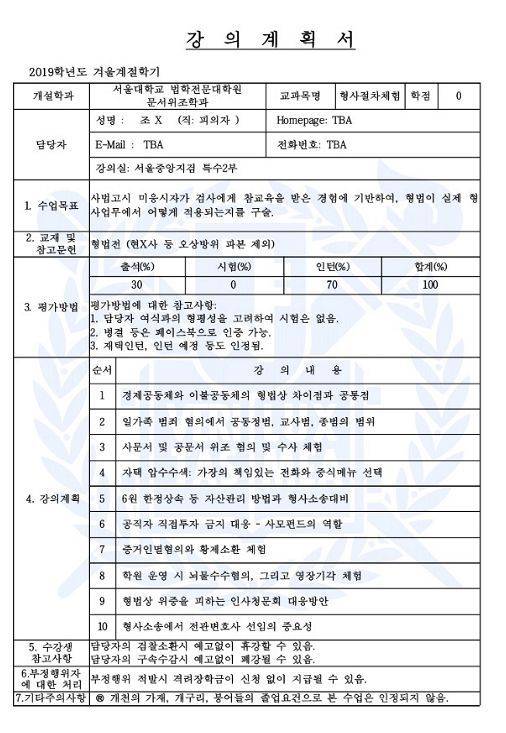 이들이 공개한 이미지는 패러디 버전의 '강의계획서'로 '서울대 법학전문대학원 문서위조학과', 강의명은 '형사절차 체험'이다. 강의 담당자는 '피의자 조모씨'로 돼 있다.