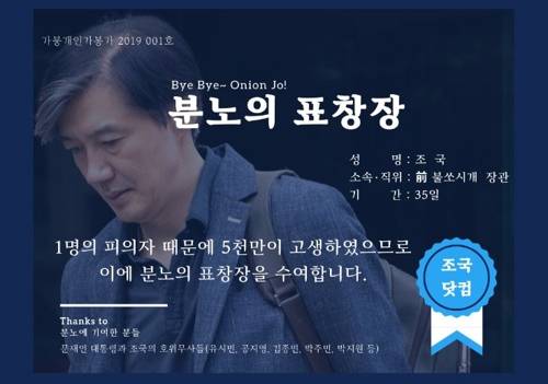 이들이 보낸 표창장 문서에는 조 전 장관의 소속·직위를 '전(前) 불쏘시개 장관'이라고 명시했다. 또한 "피의자 한 명 때문에 5000만명이 고생했으므로 분노의 표창장을 수여한다"고 했다. 앞서 조 전 장관은 2016년 11월 26일 조 전 장관이 박근혜 대통령 퇴진 촛불집회가 한창이던 때 자신의 트위터에 "1명의 피의자 때문에 5천만이 고생이다"라고 올렸는데, 이를 풍자한 것으로 보인다.