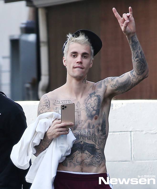 저스틴 비버는 이날 상의를 벗은 채 길거리를 활보했다. 상반신 가득 문신이 마치 옷을 입은 것처럼 빼곡히 자리하고 있어 눈길을 끌었다.