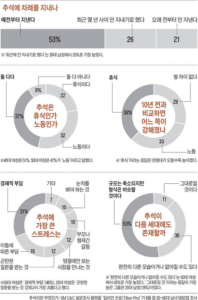 지난해 가을 '추석이란 무엇인가'라는 칼럼(김영민 서울대 교수)이 화제를 모았다. 당숙이 "너 언제 취직할 거니?" 물으면, 얼버무리지 말고 "당숙이란 무엇인가?" 대꾸하라는 식이다. 위트가 돋보였지만 현실에서 써먹을 순 없었다. 보통 사람들은 어떻게 추석을 나고 있을까. '아무튼, 주말'이 SM C&C '틸리언 프로(Tillion Pro)'에 설문조사를 의뢰했다. 연령대별로 1000여 명씩 20~60대 남녀 5052명이 응답했다.