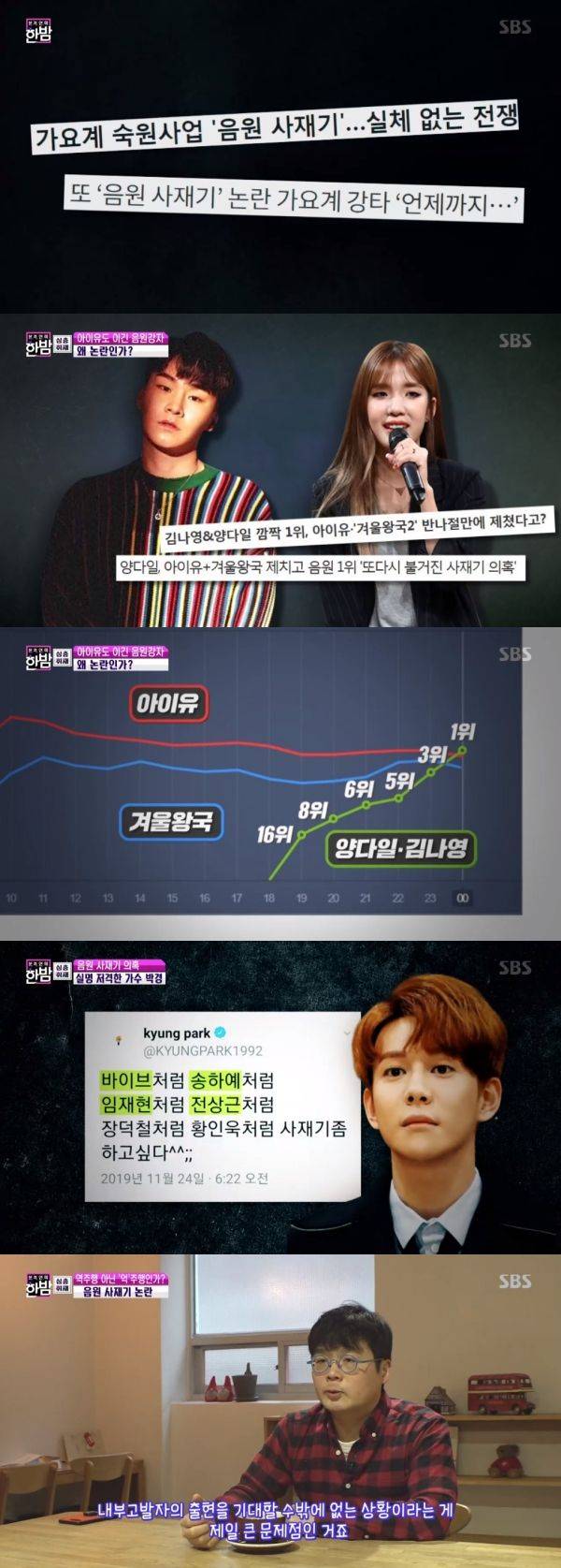 3일 방송된 SBS '본격연예 한밤'(이하 '한밤')에서는 최근 불거진 음원 사재기 논란을 심층 보도했다.
