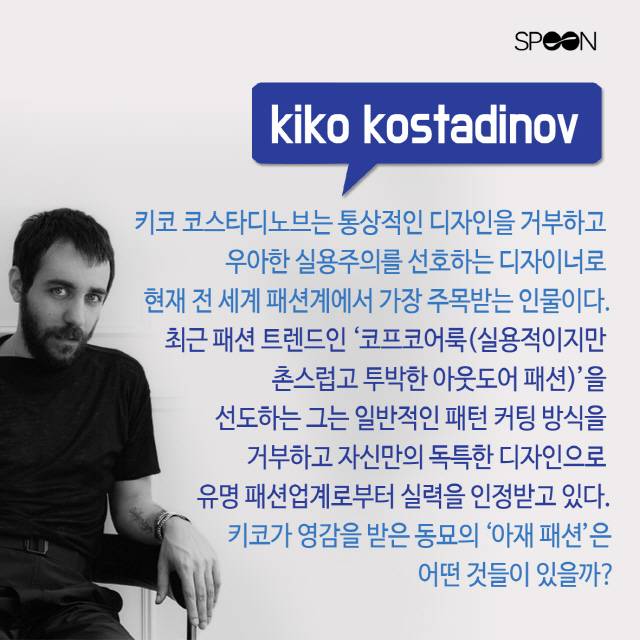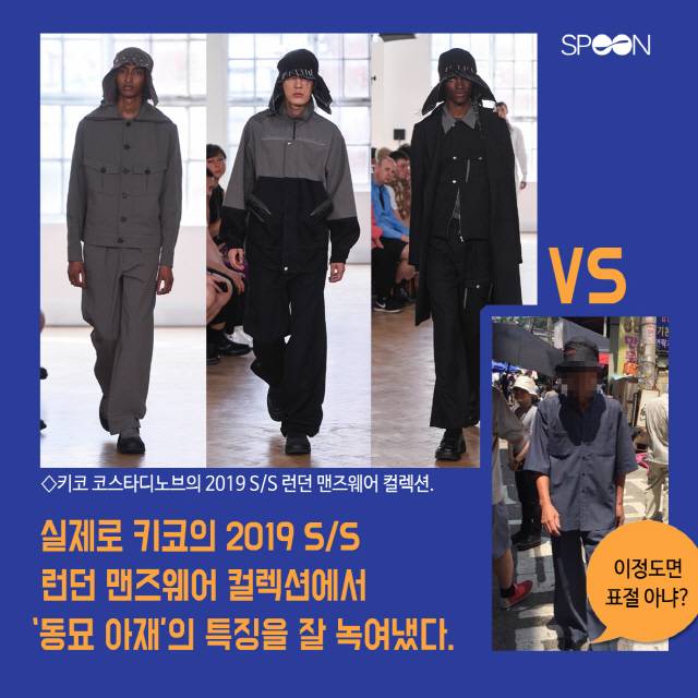 영국에서 활동하고 있는 패션 디자이너 키코 코스타디노브가 지난해 7월 서울 동묘 인근의 시장을 방문 후 자신의 인스타그램에 남긴 소감이다. 키코는 통상적인 디자인을 거부하고 우아한 실용주의를 선호하는 디자이너로 현재 전 세계 패션계에서 가장 주목받는 인물이다. 최근 패션 트렌드인 '코프코어룩(실용적이지만 촌스럽고 투박한 아웃도어 패션)'을 선도하고 있는 그가 영감을 받은 동묘의 '아재 패션'은 어떤 것들이 있을까? 김수진 기자 vivid@sportschosun.com
