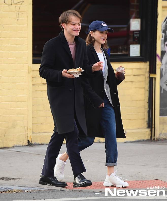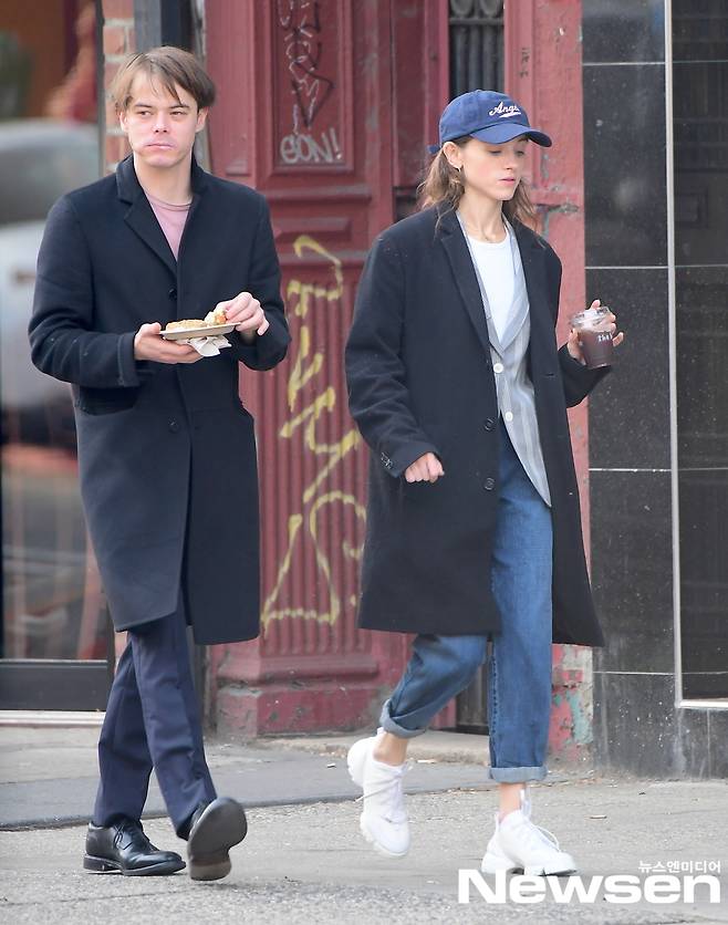 배우 찰리 히튼과 나탈리아 다이어는 11월 11일(현지시간) 미국 뉴욕 한 커피숍에서 나와 다정한 길거리 데이트를 즐겼다.