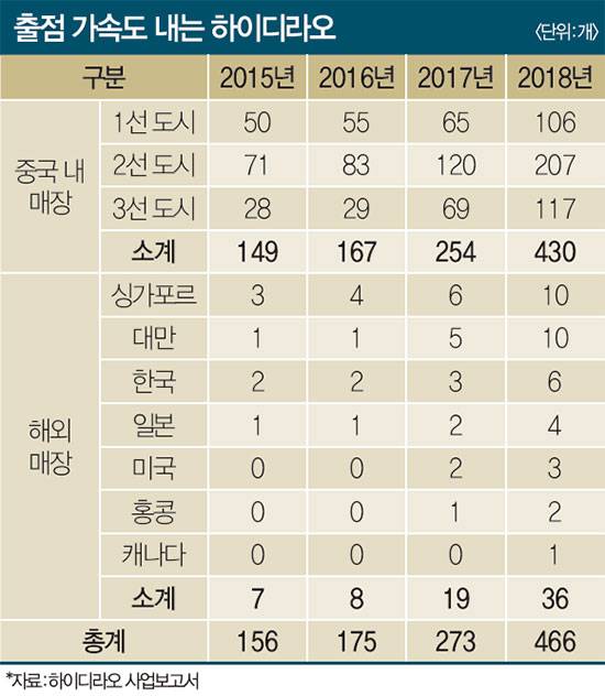 하이디라오의 지난해 매출과 영업이익은 각각 170억위안(약 2조9200억원), 22억5700만위안(약 3889억원). 시총에 비하면 비교적 초라한 실적이다. 그럼에도 하이디라오 주가는 상장 1년도 안 돼 두 배 이상 급등하며 고공행진 중이다. 매년 두 자릿수로 증가하는 공격적 출점을 통해 외형 확장에 나서고 있기 때문이다. 하이디라오 매장 수는 2015년 156개(중국 149개, 해외 7개)에서 지난해 466개(중국 430개, 해외 36개)로 3년 만에 3배 증가했다. 이에 따라 매출과 순이익도 같은 기간 9919억원, 708억원에서 2조9238억원, 2841억원으로 3배 이상 늘었다. 전 세계에 3600만명이 넘는 회원과 7만명 이상의 직원을 두고 있으며, 중국 본토를 넘어 홍콩·대만·싱가포르·미국·한국·일본·캐나다·호주 등 10여개국 100여개 도시에 진출한 글로벌 외식 기업이 됐다. 올해에도 영국, 베트남, 말레이시아 등 신시장에 진출하며 꾸준히 영토 확장을 하고 있다.