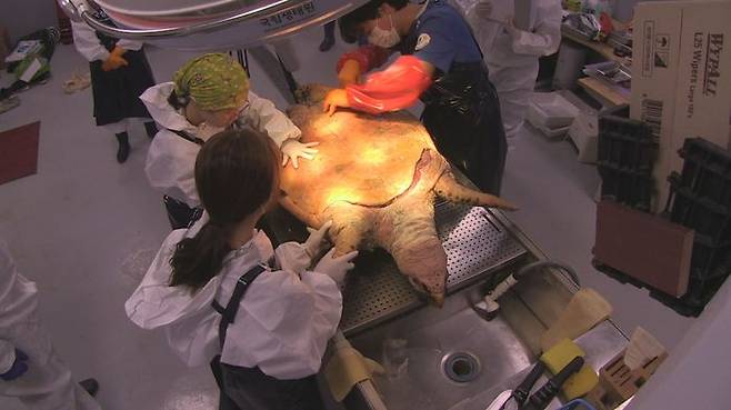 우리나라 주변 동해와 남해, 서해에서는 연간 평균 20여 마리의 바다거북 폐사체가 발견된다. 국립해양생물자원관은 지난해부터 국립생태원에 의뢰해 바다거북 폐사체를 부검하고 있다. 죽음의 원인을 밝히는 게 목적이고 국제적 멸종위기종인 바다거북의 장내 유기물 분석 필요도 있다. 기생충과 먹이원, 해양 쓰레기 및 미생물 시료를 확보해 연구활동에 쓰기 위함이다.