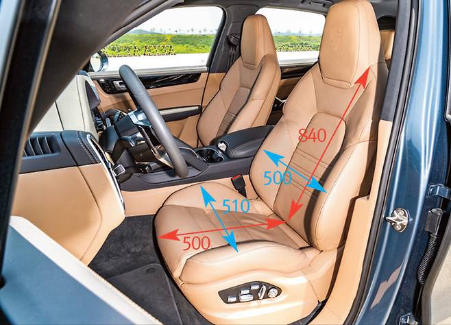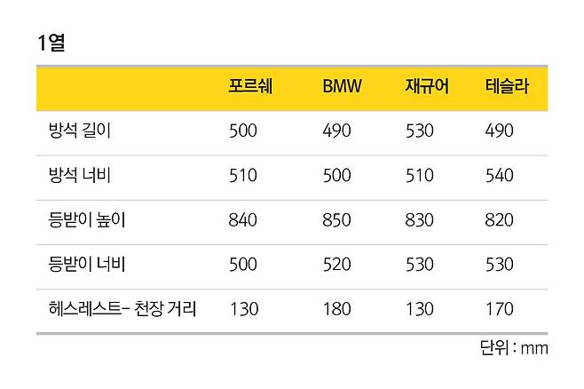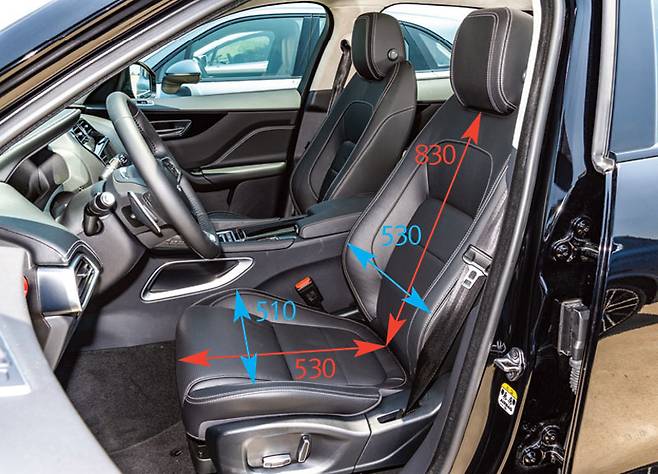 방석의 길이 재규어 F-페이스가 530mm으로 가장 길고 너비는 테슬라 모델 X가 540mm로 가장 넓다. 우리나라 운전자의 신체조건을 고려하면 크게 문제 될 것은 없다. 오히려 다리가 긴 운전자에겐 X5 나 모델 X가 유리할지도. 우리나라 사람의 평균 엉덩이 너비는 약 328.987mm다. 방석 너비는 4대 모두 충분하고도 남는다.