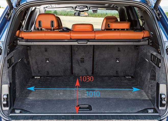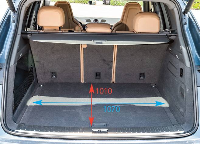 SUV에서 주요 공간으로 책정되는 곳, 트렁크다. 카이엔은 길이 1010mm, 너비 1070mm다. X5는 길이 1030mm, 너비 1010mm, F-페이스 1010mm, 880mm다. 모델 X는 3열까지 존재하는 관계로 3열 폴딩 후 측정했다. 길이는 1120mm, 1130mm다. 5050mm의 전장과 2965mm의 휠베이스가 빛을 발하는 순간이다.