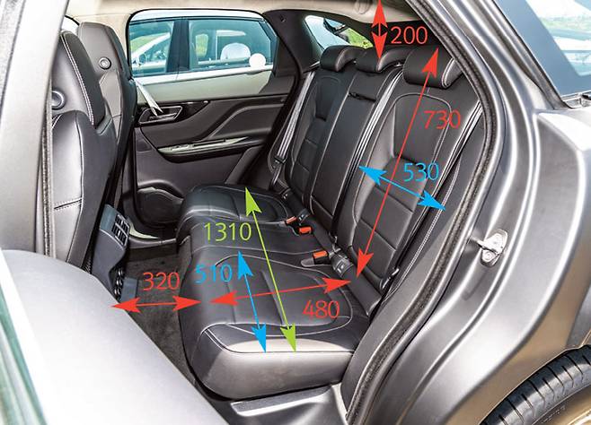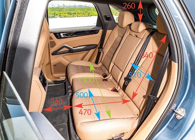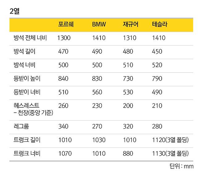 1열 시트를 키 174cm의 남성이 편안히 운전할 수 있는 위치로 조절한 후 2열 공간을 측정했다. 2열 전체 너비는 X5와 모델 X가 1410mm로 가장 넓고 카이엔이 1300mm로 가장 작다. 개별 너비로 본다면 모델 X, F-페이스가 520mm, 510mm고 카이엔과 X5가 500mm로 같다. 방석 길이는 오히려 모델 X가 450mm로 가장 짧다.