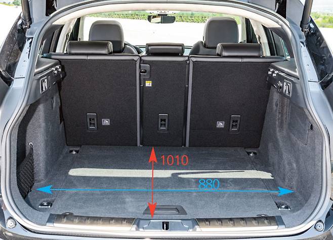레그룸의 수치를 살펴보면 카이엔, F-페이스, 모델 X, X5 순인데 5050mm의 전장과 2965mm의 휠베이스를 가진 모델 X는 좀 의외다. 등받이의 높이는 카이엔이 840mm로 가장 높고 F-페이스가 730mm로 가장 낮게 측정됐다.