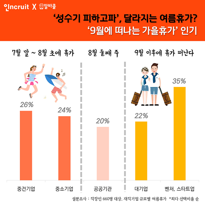 즉, 여름휴가는 여전히 ‘7말8초’가 인기인 가운데 올해는 예년보다 9월 이후 늦은 여름휴가를 가질 직장인들이 많은 것으로 전망된다.