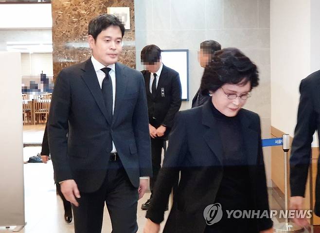 (서울=연합뉴스) 김영신 기자 = 신세계 이명희 회장과 아들 정용진 부회장이 15일 서울 한 대형병원 장례식장에 마련된 고 구자경 LG그룹 명예회장 빈소를 조문 후 빈소를 나서고 있다. LG와 삼성, 신세계는 사돈 관계다. 고 구인회 LG 창업회장의 3남이자 구자경 명예회장의 동생인 구자학 아워홈 회장과 삼성 이병철 창업회장의 차녀 이숙희 여사(이명희 회장의 언니)가 1957년 결혼했다. 2019.12.15
