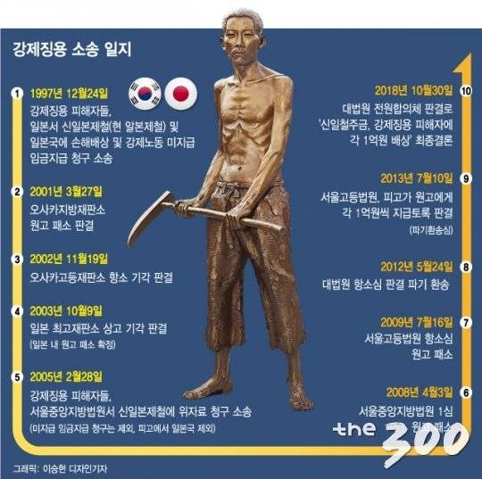 대법원은 그러나 2012년 강제징용 피해자가 신일철주금을 상대로 낸 불법행위에 대한 위자료청구 소송에서 원고 패소 판결한 원심을 깨고 “일본 기업들이 피해자들에게 손해배상을 해야 한다”고 판시했다. 요지는 일본 식민지배가 불법이므로 강제징용도 불법이어서 피해자들의 위자료(손해배상) 청구권이 인정된다는 것이다.