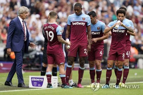 epa07766081 Manager of West Ham, Manuel Pellegrini (L), with West Ham players during the English Premier League soccer match between West Ham and Manchester City at the London Stadium, London, Britain, 10 August 2019. EPA/WILL OLIVER EDITORIAL USE ONLY. No use with unauthorized audio, video, data, fixture lists, club/league logos or 'live' services. Online in-match use limited to 120 images, no video emulation. No use in betting, games or single club/league/player publications