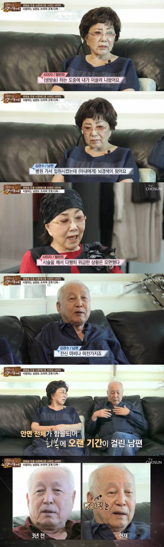 사미자 남편은 "작년 8월 10일이다. 잊어버리지도 않는다. 아내가 그 전날 지방 공연 다녀오더니 몸을 움직이지를 못하더라. 그러면서 도착해서 새벽에 아침 생방송을 나가겠다고 하더라. 취소 좀 해달라고 전화하라고 했는데도 출연하겠다더라"며 "스튜디오에 갔는데 심상치가 않으니까 카메라에 되도록 안 잡히게 하려고 아내를 구석자리로 빼주더라"며 회상했다.