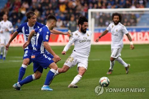 epa08034979 Real Madrid's Francisco Alarcon 'ISco' (C) vies for the ball with Alaves' Tomas Pina (L) during the Spanish LaLiga soccer match between Alaves and Real Madrid at Mendizorroza stadium in Vitoria, Basque Country, Spain, 30 November 2019. EPA/David Aguilar