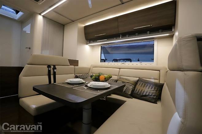 Q18의 인테리어는 세련되고 고급스럽다. 가구에 간접조명으로 실내를 밝게 비추고 더 넓고 따뜻한 분위기를 느끼게 한다. 주방 공간은 출입구 바로 옆으로 커다란 타워 냉장고가 별도로 배치되어 있고, 곡면을 잘 살린 가구 곳곳에 알차게 수납공간을 마련했다.