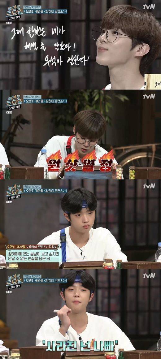 김우석은 정답인 "아무 소리 없이 사라진 넌 나빠 / 너는 내가 아마 처음 느낀 사랑일 걸 / 꿈이지만 난 네 거"의 마지막 부분을 정확히 적었고 알 없는 안경을 쓰며 원샷에 잡힐 준비를 했다.