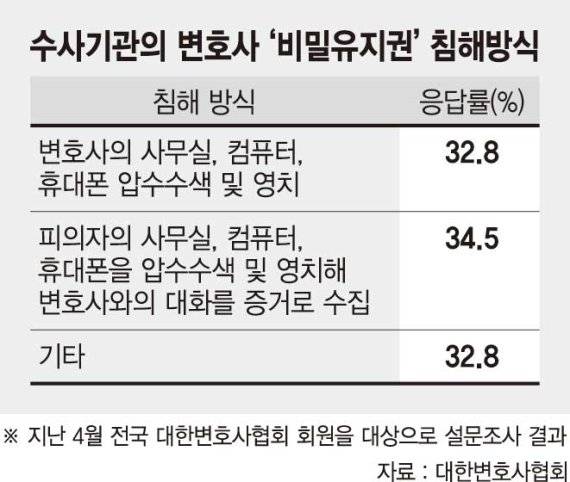 천하람 대한변호사협회 제2법제이사는 "검찰 등 수사기관이 변호사의 비밀유지권을 침해한 구체적인 사례를 살펴보니, 의뢰인과 변호사의 접촉한 여부에서부터 피고인과 구치소에서 접견한 변호사에게 연락해 피고인과의 상담 내용을 밝히지 않을 경우 피고인에게 불이익한 조치를 취하겠다고 협박을 한 사례 등이 조사됐다"고 밝혔다.