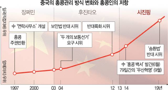 홍콩 반환 당시 국가주석이었던 장쩌민 시대에 보장된 홍콩 자치권은 후진타오 정부 들어 점차 훼손됐다. 2003년 보안법 반대시위가 분기점이다. 당시 둥젠화 행정장관이 한국의 국가보안법과 유사한 보안법을 만들려고 하자 시민들이 이에 반대하면서 대규모 시위가 벌어졌다. 보안법 입법은 결국 무산됐지만 홍콩 시민사회의 성장에 두려움을 느낀 중국은 홍콩에 대한 통제권을 강화했다. 홍콩 주재 연락사무소를 이용해 홍콩 정부를 배후조종하기 시작한 것이다.