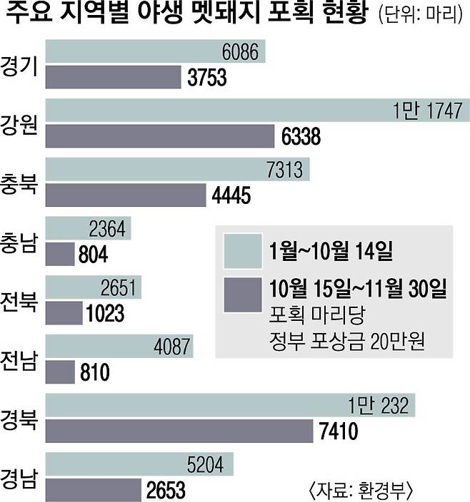 경북의 경우 10월 초반까지만 하더라도 하루 70여 마리의 멧돼지가 포획됐으나 같은 달 중반 이후 최대 200여 마리로 포획 멧돼지 수가 3배 가까이 증가했다. 경남에서도 지난 9월까지 하루 평균 멧돼지 17마리가 포획됐으나 지난 10월 들어 2배 이상인 하루 41마리로 늘었다. 지난해 하루 평균 멧돼지 포획 수가 12마리 정도인 점을 감안하면 포획량이 5배나 늘어난 것이다.