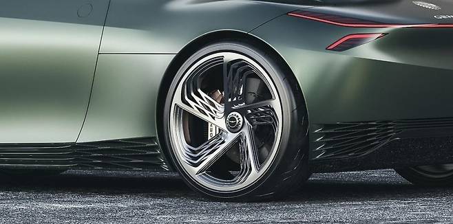 그런데 이 방식이 눈에 익는다. 3개월 전 4월 19일 뉴욕 모터쇼에서 선보인 제네시스 민트 컨셉트에서다. 외부 패널 하단과 휠 디자인에 동일한 방식이 쓰였다. 물론 아주 동일하지는 않다. 민트의 것엔 3D 입체성이 덧붙여진 좀 더 고차원적인 형태다.