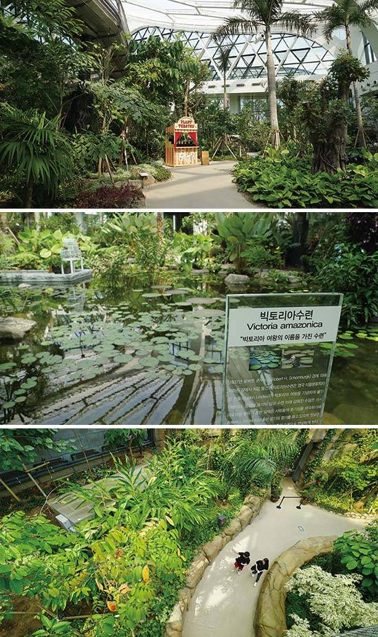 열대관에서 처음 만나는 도시는 인도네시아 자카르타. 도시의 특징을 나타내는 정원과 대표 식물로 구성되어 있다. 대표 식물은 인도보리수와 초령목. 인도보리수는 3000년을 살고, 가지에서 공중 뿌리가 나와 옆으로 점점 커지는 신비의 나무다. 뿌리가 땅 속에 남아 영양을 빨아들이는 역할을 한다는 게 상식인데, 공중에 솟아 있는 가지에서 새로운 뿌리가 나온다니! 이것은 신비를 넘어 미래의 세상을 보는 것같은 충격을 주기에 충분하다. 초령목은 신령을 부른다는 나무로 흐드러진 하얀 꽃을 피운다. 한국에서는 제주도에 몇 그루 남아있는 멸종위기종으로 기록되어 있다. 다음으로 베트남 하노이 정원에서는 ‘망고’, ‘파파야’, ‘카카오’ 등 세계인이 즐겨 먹는 과일과 열매도 볼 수 있다. 세 번째는 콜롬비아 보고타의 커피와 코코넛야자. 세계 3위의 커피 생산국이자 수많은 브랜드와 연관어로 등장하는 ‘콜롬비아’. 커피 나무는 열대 작물이지만 이제 한국의 제주도 등에서도 재배에 성공, 비록 그 규모는 작지만 낯선 식물은 아니다. 열대관에서 마주하게 될 마지막 도시와 식물은 브라질 상파울루의 빅토리아 수련과 맹그로브. 이곳은 열대관에서 가장 큰 면적을 차지하고 있다. 빅토리아 수련은 식물학자 존 린들리가 아마존에서 발견한 수련으로 세계에서 가장 크고 아름다운 잎으로 인정받고 있다. 대형 잎의 지름은 무려 3m에 달해 사람이 올라가 앉아도 될 정도이다. 맹그로브는 열대 지역 특유의 식물로 물가에서 무리를 이루고 있는 게 보통이다.