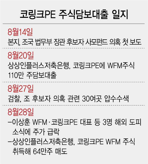 ◇상상인·포스링크·에이도스와 조씨 관계는=조씨 등이 해외도피 직전 주식담보대출을 받은 상상인 계열 저축은행도 이들과 특수한 관계로 보인다. 상상인플러스저축은행은 지난달 28일 코링크PE로부터 담보로 설정했던 WFM 주식 110만주의 담보처분권을 취득해 63만5,000주를 처분했다. 이날은 동아일보가 사모펀드의 핵심 인물인 조씨와 이 대표, 우씨 등 3명이 해외도피했다고 보도하면서 WFM의 주가가 급락한 날이다. 이 대출이 이뤄진 날짜는 사모펀드 관련 의혹이 본격적으로 쏟아지던 지난달 20일이다. 따라서 이들이 해외도피하기 전 코링크PE 110만주를 담보로 20억원 상당의 대출을 받았고, 이날 주가 하락으로 반대매매가 일어난 것으로 풀이된다. 또한 WFM과 얽혀있는 포스링크·에이도스란 회사들도 상상인 계열 저축은행을 매개로 등장한다. 상상인플러스저축은행은 지난해 말 WFM이 에이도스와 포스링크로부터 각각 50억여원에 매입한 서울 성수동 서울숲 갤러리아포레 지하1층 상가 2곳에 총 130억원의 근저당권부근질권을 설정한 바 있다. 이는 WFM의 전환사채 100억원을 보유한 엣온파트너스가 해당 상가들에 설정한 근저당권 130억원에 설정한 질권이다. 업계에서는 엣온파트너스가 상상인플러스저축은행에서 100억여원을 대출해 전환사채를 인수한 것으로 해석한다. 즉 자금흐름만 보면 상상인플러스저축은행의 100억원이 WFM을 거쳐 에이도스와 포스링크에 50억원씩 흘러간 셈이다. 더군다나 코링크PE와 포스링크는 상당히 오래된 사이다. 코링크PE는 2016년 레드코어 펀드에서 25억원을 포스링크 유상증자에 투자했으며 경영권 인수까지 내다보기도 했다. 상상인 계열 저축은행도 포스링크와 꽤 깊은 관계가 있다. 상상인플러스저축은행과 상상인저축은행은 지난 2017년께부터 포스링크의 주식·전환사채 보유자들에게 여러 차례 담보대출을 해왔다. 그러나 채무자들의 대출 상환이 여의치 않았는지 최근 상상인저축은행 측은 차례로 담보처분권을 행사하면서 포스링크 전환사채를 전체 주식의 16% 규모까지 보유한 상태다. 따라서 이 네 회사 간의 관계가 검찰 수사에서 드러날지 주목된다. 검찰은 코링크PE에서 일어난 자금흐름은 샅샅이 들여다본다는 방침이다. 상상인 계열 저축은행의 사주는 최근 골든브릿지증권(현 상상인증권)을 인수한 ‘슈퍼개미’ 유준원 상상인 대표다. 에이도스는 서울숲 갤러리아포레 상가 지하 1층에서 중식당을 운영하고 있는 것으로 알려졌다.