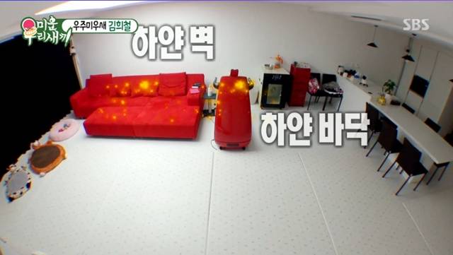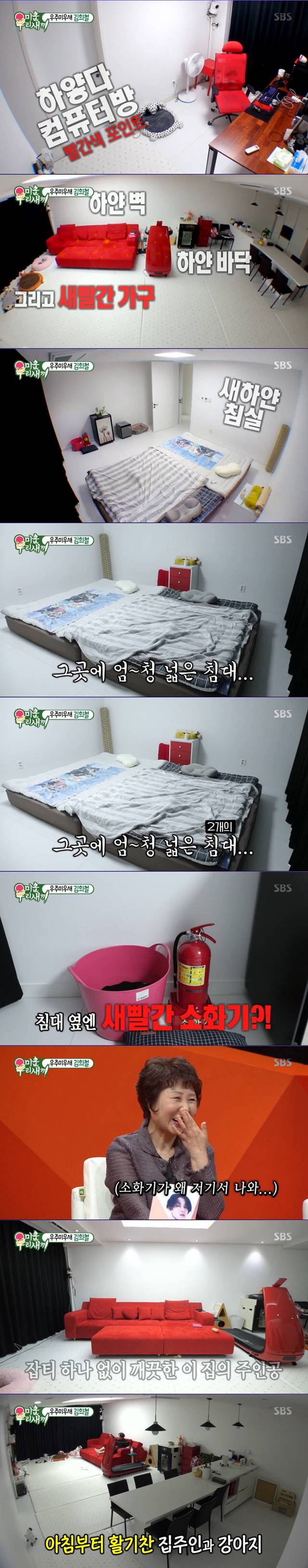 이날 공개된 김희철의 침실과 거실은 온통 흰색이었다. 특히 하얀 벽, 하얀 바닥, 새빨간 쇼파가 눈길을 끌었다. 침실에는 큰 사이즈 침대 두 개가 놓여 있었고, 빨간 소화기도 놓여 있었다.