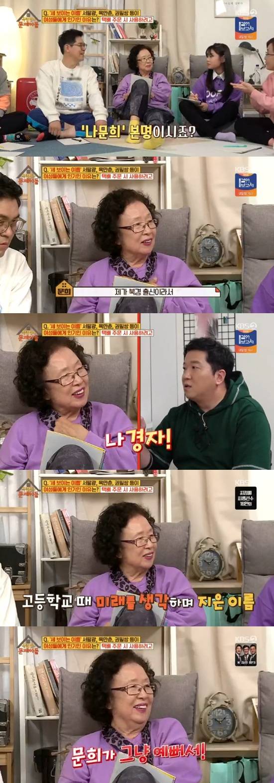 이어 송은이는 "'문희는요' 하시던 걸 너무 재미있게 봤다. '은이는요' 하고 다녔다. 나문희가 본명이시냐"고 질문했고, 나문희는 "아니다. 북경 출신이라서 나경자가 본명이다"고 답했다.