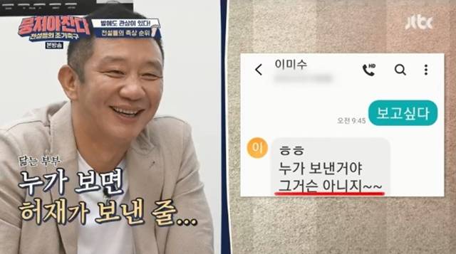 이어 아내들의 문자가 도착했고, 이만기 아내는 "메시지 잘 못 보내셨네요"라고 해 모두를 폭소케 했다. 허재 아내 역시 "그거슨 아니지"라고 해 웃음을 자아냈다.(사진=JTBC '뭉쳐야 찬다' 캡처)