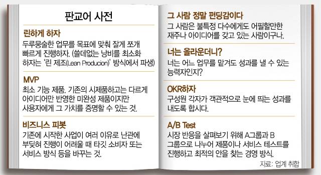 스타트업들이 몰려 있는 경기도 판교나 서울 강남 테헤란로 사무실을 들어가 보면 쏟아지는 낯선 용어에 당혹스러울 때가 있다. 일반인들이 평소 쉽게 접하기 어려운 생소한 것들인데 스타트업 직원들은 이를 ‘판교어’나 일반인들이 잘 알아듣지 못한다는 의미에서 ‘판교 사투리’라고 부르고 있다. 초중학생들이 즐겨 쓰는 약어나 은어를 가리켜 ‘초딩어’ ‘중딩어’라고 부르듯이 스타트업 세계에서도 다양한 은어들이 만들어지고 있는 것이다. 업계에서는 정보기술(IT)이나 디자인 업계 종사자들끼리 즐겨 쓰던 말이 스타트업의 독특한 조직문화와 결합돼 새 언어로 힘을 얻어가고 있다고 분석했다.