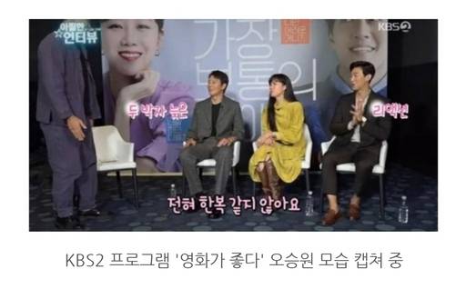 또 지난 14일 방송된 KBS2 프로그램 '영화가 좋다'의 '아찔한 인터뷰' 코너에서 영화 '가장 보통의 연예' 인터뷰 중 MC 오승원은 "추석을 맞아 제가 특별히 한복을 입었습니다"라며 생활 한복 패션을 뽐냈고 이에 영화 배우 공효진이 "전혀 한복같지 않아요"라고 말했다.