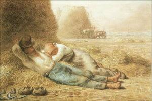 1866년 완성한 ‘낮잠’ 역시 어린 시절 감명받은 농부의 삶을 떠올리며 그린 걸작으로 꼽힌다. 파리 교외의 작은 마을 바르비종에서 농민 부부가 힘겹게 보리를 벤 뒤 보리 더미 그늘에서 낮잠 자는 모습을 정교하게 잡아냈다. 왼쪽 보리 더미 아래 부부가 누워 있고, 그 옆에 낫 두 개와 신발 두 짝이 놓여 있다. 멀리 소 두 마리가 한가롭게 서 있다. 파스텔톤의 색채와 명암 대비, 선의 디테일을 살려 일에 지쳐 곯아떨어진 농부의 애환을 생생하게 되살렸다.