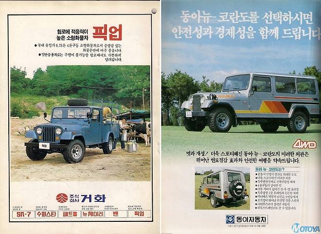 쌍용자동차의 코란도는 거화 시절만 해도 다양한 가지치기 모델들이 존재했다. 기본적인 숏바디 형태의 차종은 물론, 9~12인승 사양의 롱 바디 모델도 존재했으며, 심지어 픽업트럭형 모델도 존재했다. 하지만 동아자동차에 인수된 직후인 1985년도 이후, 경제성을 이유로 저성능의 엔진을 채용함과 더불어 경쟁력이 나빠지기 시작했다. 또한 차량 자체의 형태 역시 당시의 국내 자동차 시장의 요구에는 다소 어울리지 않았다. 코란도는 군용 차량의 특색이 그대로 남아 있는 매우 고전적인 형태의 SUV였기 때문에 승용 시장에서는 판매량이 제한적일 수 밖에 없었던 것이다.