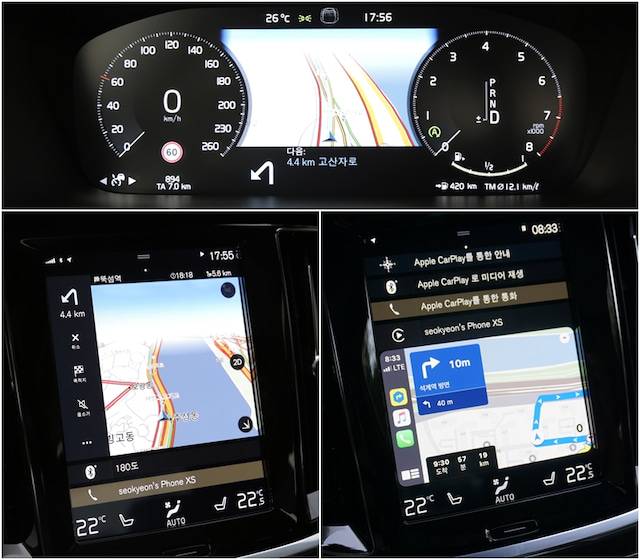 마지막으로 예뻤지만 아쉬웠던 세로형 디스플레이를 짚고 마무리하겠다. S60에는 국내형 내비게이션이 탑재된다. 센터 스크린을 가득 채울뿐더러 계기판에도 보기 쉽게 구현된다. 하지만 휴대폰을 연결해 내비(애플 카플레이)를 구동하면 스크린 아래쪽 일부에 가로로 표시된다. 스마트폰 화면 크기와 별반 다르지 않다. 또한 계기판과 HUD에도 표현되지 않는다. 한국형 내비와 카플레이 지원까지는 좋았지만 큼직한 가로형 디스플레이에 비해 답답한 모습이다.