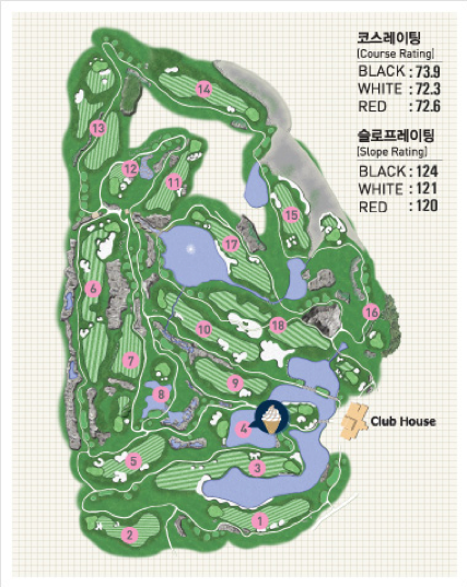 코스 레이팅은 일반적으로 스코어 카드 혹은 홈페이지를 참고하면 됩니다. 물론 공인인증 골프장에 한해서 이러한 방식이 유효할 것입니다. 아래 국내의 한 골프장의 코스 레이팅 정보를 참고하여 설명해 보겠습니다.
