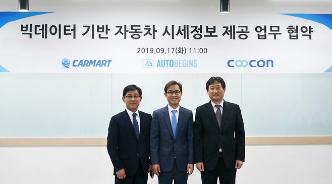 비즈니스 정보 제공 전문기업 쿠콘(대표 김종현, 장영환)이 온라인 자동차 플랫폼 비즈니스 전문기업 오토비긴즈(대표 박정만), 자동차 시세 정보 전문기업 카마트(대표 김흥곤)와 ‘빅데이터 기반 자동차 시세정보 제공 업무 협약(MOU)’을 체결했다고 23일 밝혔다.